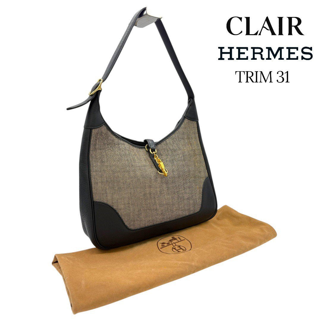 エルメス トリム31 ブラックレザー トワルアッシュ ゴールド金具 キャンバス